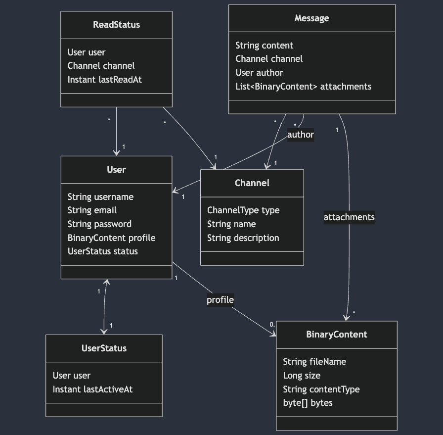 엔티티 관계 다중성 방향성 부모-자식 관계 연관관계 주인 User:UserStatus 1:1 User ↔️ UserStatus 부모: User, 자식: UserStatus UserStatus User:BinaryContent 1:1 User ➡️ BinaryContent 부모: User, 자식: BinaryContent User User:ReadStatus 1:N User ⬅️ ReadStatus 부모: User, 자식: ReadStatus ReadStatus Channel:ReadStatus 1:N Channel ⬅️ ReadStatus 부모: Channel, 자식: ReadStatus ReadStatus Channel:Message 1:N Channel ⬅️ Message 부모: Channel, 자식: Message Message User:Message 1:N User ⬅️ Message 부모: User, 자식: Message Message Message:BinaryContent 1:N Message ➡️ BinaryContent 부모: Message, 자식: BinaryContent Message